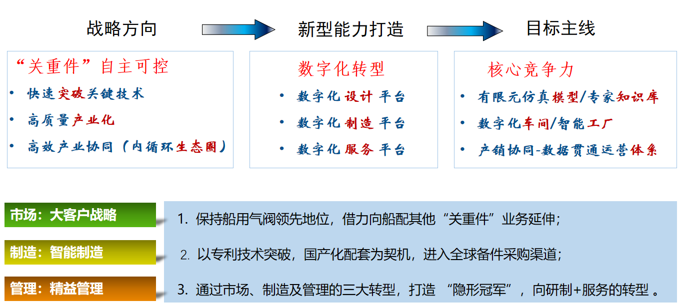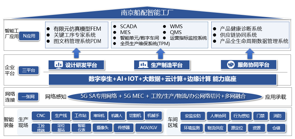 在企業資源和能力有限的條件下,南京船配聚焦高價值競爭優勢,選擇“企業戰略目標-優勢需求-能力打造”目標路徑,從業務、運營、組織、技術等各個要素環節的數字化改造著手,圍繞關鍵技術突破、高質量產業化、供應鏈高效協同,應用5G等新一代信息技術,開展關鍵工序建模仿真、專家系統建設,搭建數字化設計平臺;開展智能單元/數字車間建設,搭建數字化制造平臺;開展產供銷流程信息化,搭建數字化服務平臺。全面打造設計研發、生產制造、協同服務能力,逐步推進產品創新數字化、生產運營智能化、用戶服務敏捷化、產業體系生態化。