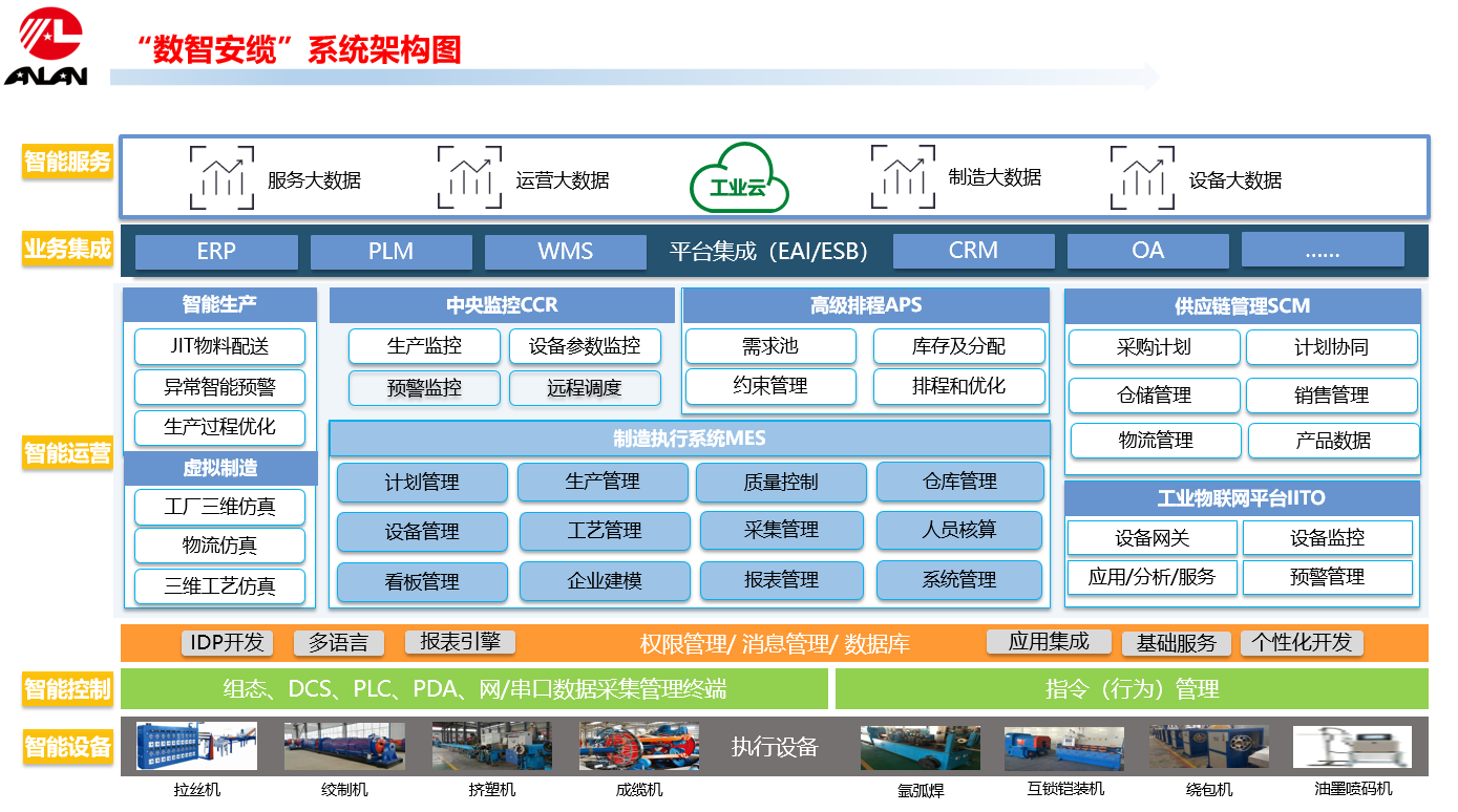 為了企業(yè)實現(xiàn)全面數(shù)智化、高質(zhì)量發(fā)展、全面精益化管理的目標,公司決定進行數(shù)字化轉(zhuǎn)型。通過打造“流程型數(shù)智安纜”模式,打造2大平臺(工業(yè)互聯(lián),設(shè)備物聯(lián)),拉通3大鏈條(供需鏈,產(chǎn)品鏈,管理鏈),建設(shè)省內(nèi)電纜行業(yè)首個智能工廠,以達到降本提效、輔助決策、打通數(shù)字化供應鏈體系及樹立行業(yè)標桿的目的。