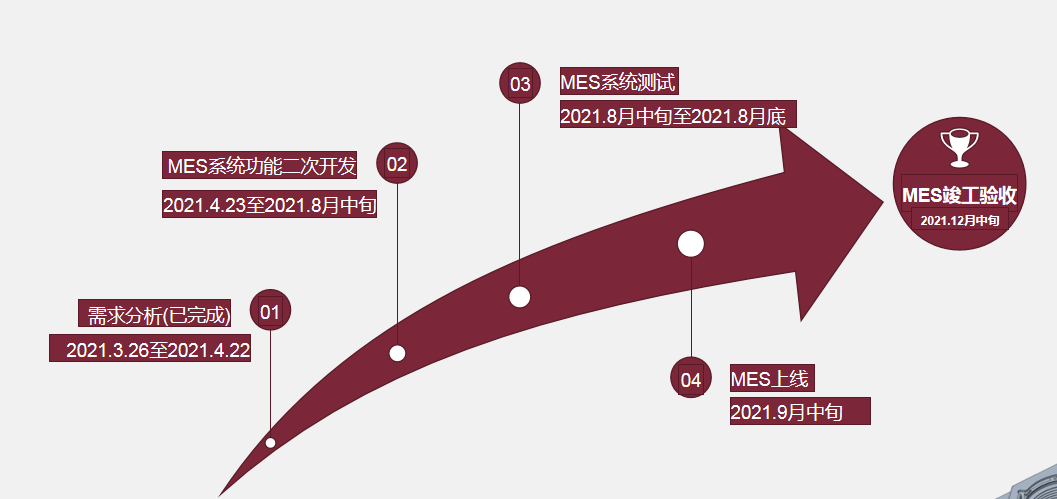 項(xiàng)目預(yù)計(jì)2021年12月完成相關(guān)產(chǎn)線的布局及設(shè)備調(diào)試,與APS、MES及SPC系統(tǒng)的運(yùn)行測(cè)試,實(shí)現(xiàn)量產(chǎn)。