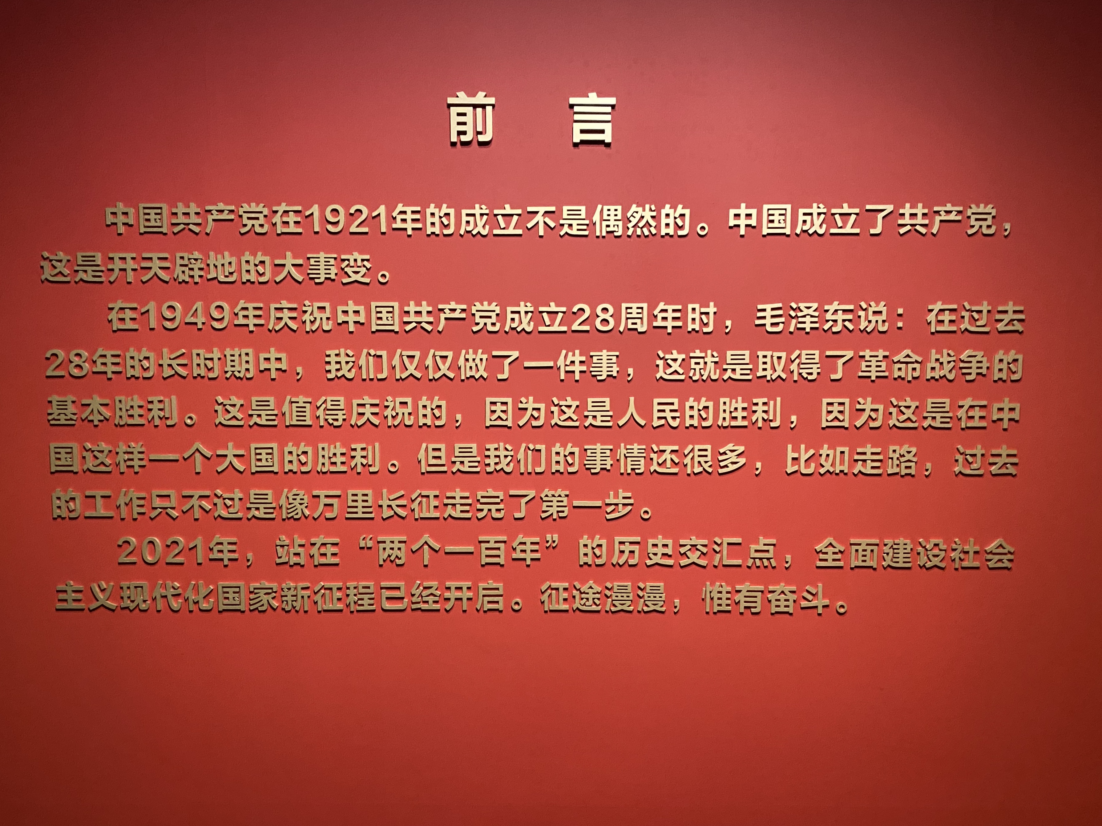 本次展覽分“東方破曉”“星火燎原”“中流砥柱”“奪取勝利”四個主題板塊,以中國共產黨的誕生、土地革命、抗日戰爭、新中國成立四個歷史時期為時間線索,用史料和文物還原重大歷史事件,以點帶面,運用數字和多媒體互動手段多維度、全方面生動展示了中國共產黨從建黨到建立新中國的革命歷程。展覽再現了中國共產黨不斷探索馬克思主義中國化的歷史進程,體現出中國共產黨是人民的政黨,是與時俱進,永葆青春的政黨。