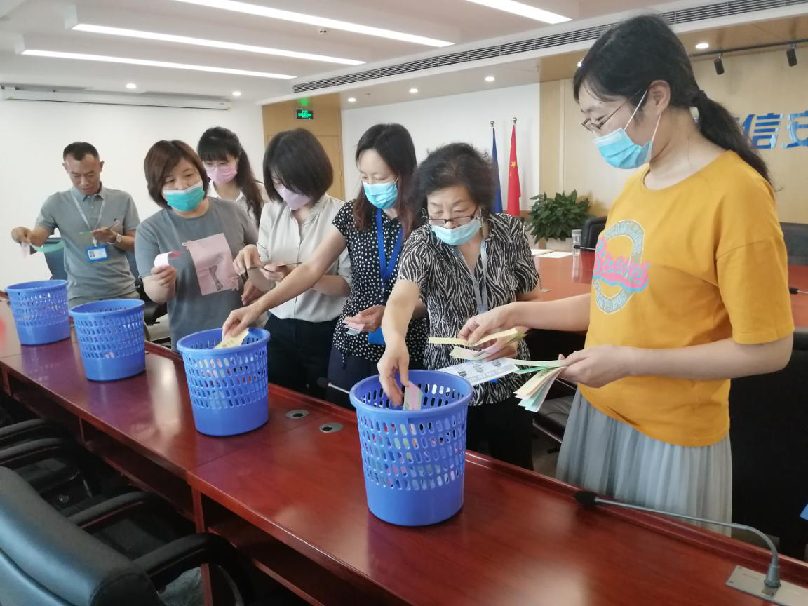 隨后,開展了現(xiàn)場實踐趣味活動。楊盼盼同志將做好的寫有各種垃圾名稱的彩色紙條分發(fā)給到場的每位黨員,要求在規(guī)定時間內(nèi)將自己手上寫有垃圾名稱的30個紙條分別放入對應(yīng)的垃圾框。經(jīng)現(xiàn)場測試,各位黨員同志都很好的完成了垃圾分類的任務(wù),學(xué)習(xí)效果良好。