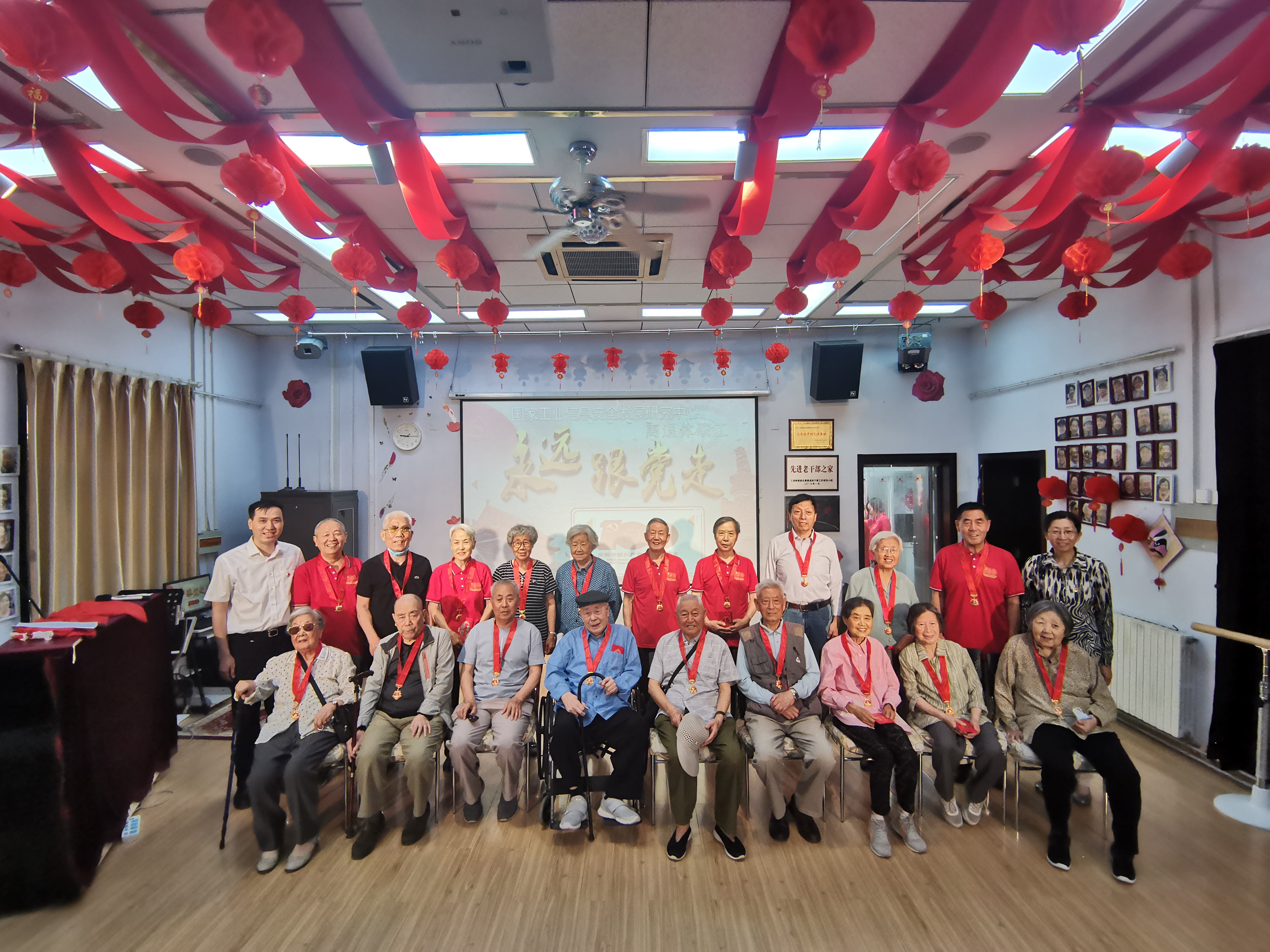 6月18日國家工安全發展研究中心在老干部活動中心舉辦“光榮在黨50年”紀念章頒發儀式和“永遠跟黨走”慶祝建黨百年文藝演出。中心黨委書記、副主任蔣艷、黨委副書記呂堅和離退休黨員代表40余人一起參加了此次活動。