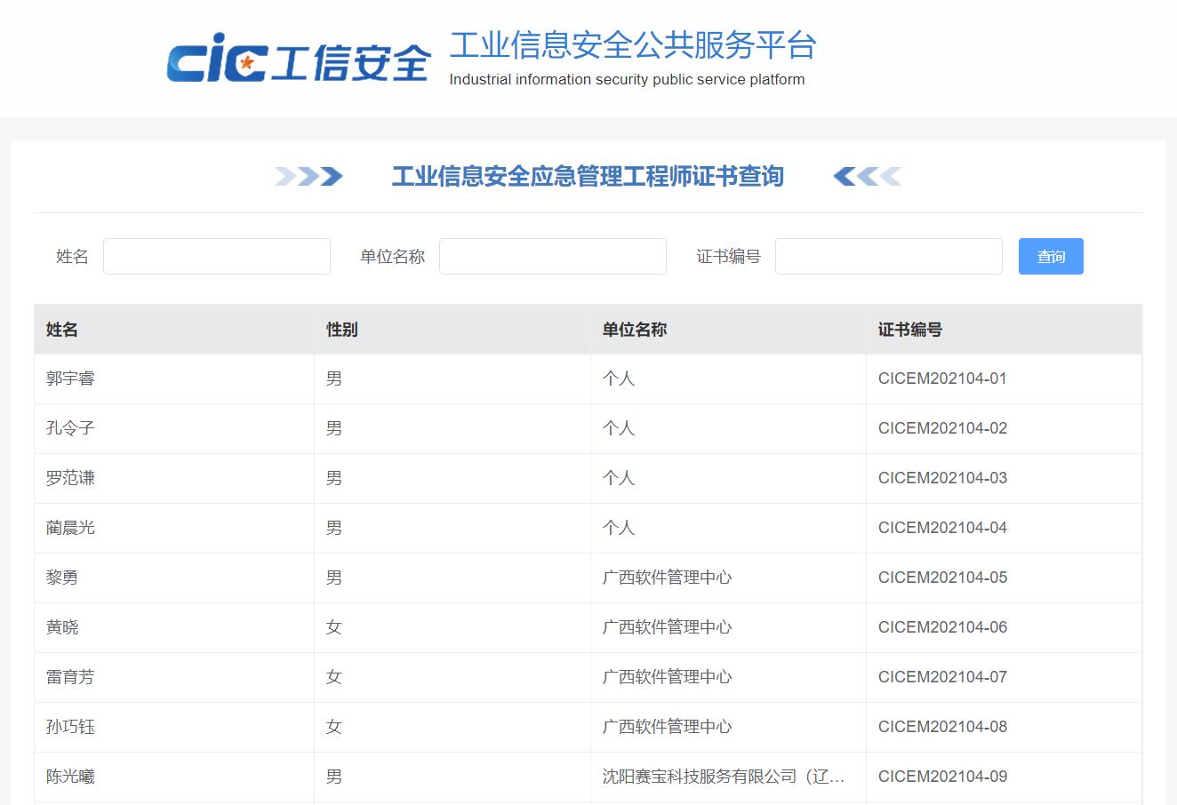 工業(yè)信息安全應(yīng)急管理工程師證書查詢系統(tǒng)正式上線