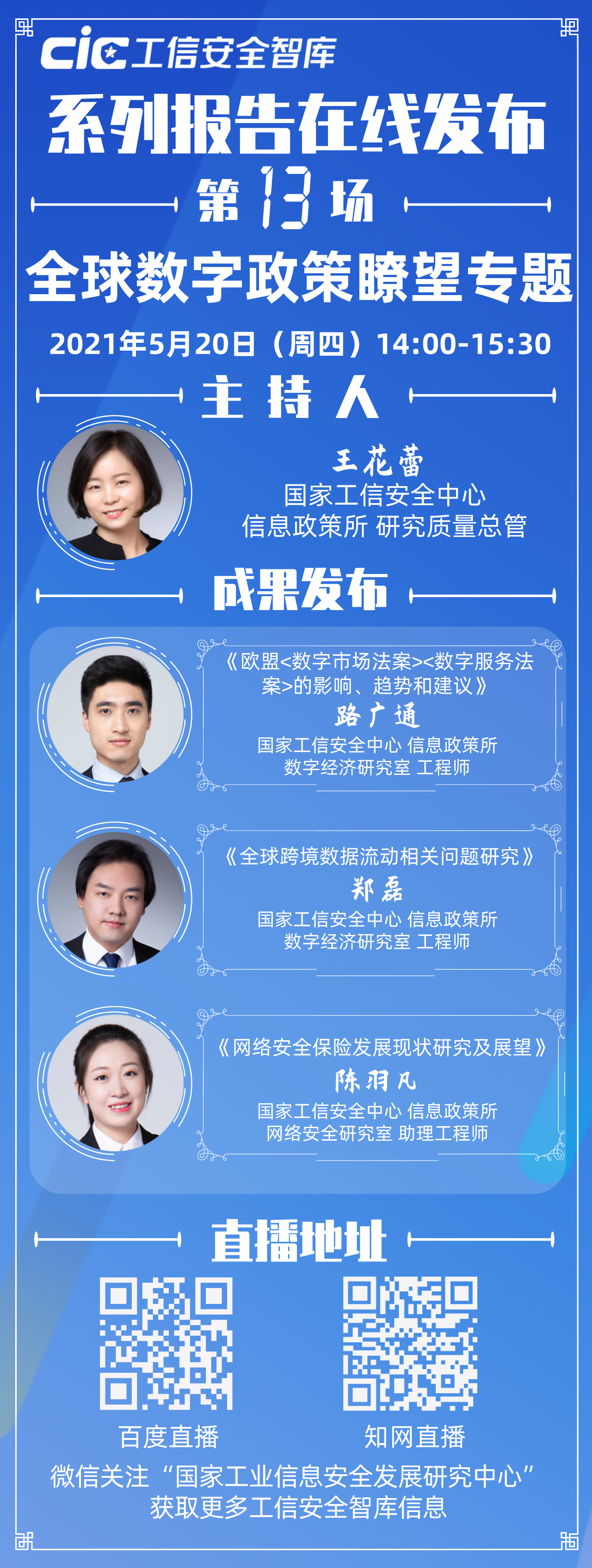 第十三場“工信安全智庫”系列報告在線發布活動將于(5月20日)下午2:00準時上線。本次發布活動以“全球數字政策瞭望”為主題,發布《歐盟<數字市場法案><數字服務法案>的影響、趨勢和建議》《全球跨境數據流動相關問題研究》《網絡安全保險發展現狀研究及展望》三份報告。發布活動將由中心信息政策所研究質量總監王花蕾博士主持。