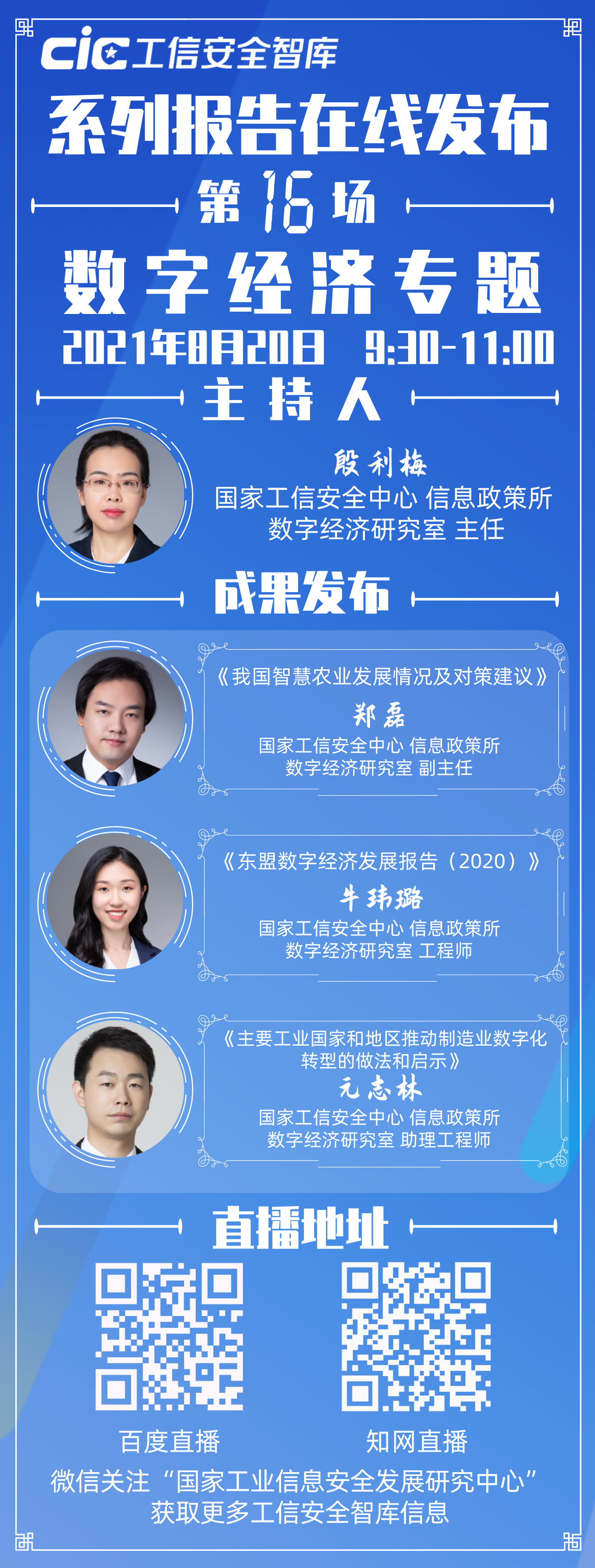 第十六場“工信安全智庫”系列報(bào)告在線發(fā)布活動將于明日(8月20日)上午9:30準(zhǔn)時(shí)上線。本次發(fā)布活動以“數(shù)字經(jīng)濟(jì)”為主題,發(fā)布《我國智慧農(nóng)業(yè)發(fā)展情況及對策建議》《東盟數(shù)字經(jīng)濟(jì)發(fā)展報(bào)告(2020)》《主要工業(yè)國家和地區(qū)推動制造業(yè)數(shù)字化轉(zhuǎn)型的做法和啟示》三份報(bào)告。發(fā)布活動將由中心信息政策所數(shù)字經(jīng)濟(jì)研究室主任殷利梅主持。
