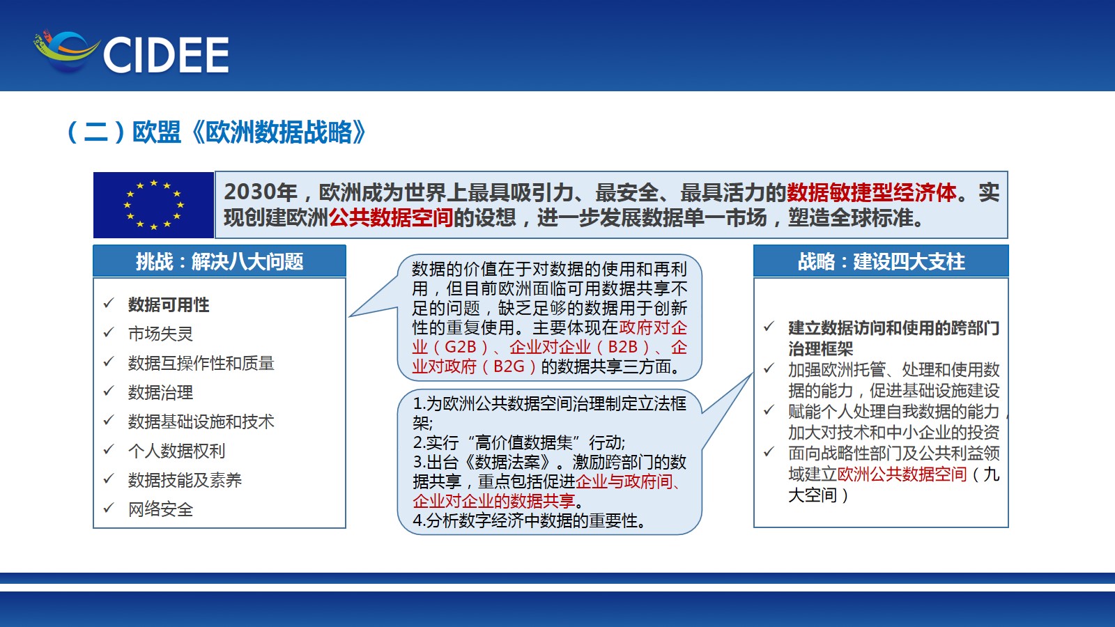 數字經濟時代,數據既是新動力,也是新生產要素。習近平總書記就實施國家大數據戰略進行第二次集體學習時強調,“推進數據資源整合和開放共享”。數據開放共享也是加快培育數據要素市場的一項重要任務,報告對數據開放共享進行研究和總結,梳理了美國《聯邦數據戰略與2020年行動計劃》、歐盟《歐洲數據戰略》、英國《國家數據戰略》等國外數據開放共享典型政策。報告指出,當前,我國數據開放共享的政策措施和管理機制日益完善、政務數據共享步伐不斷加快、公共數據有序開放、政企數據共享探索推進、企業數據共享基本處于黑箱狀態、企業數據開放以市場化行為為主。同時,也面臨數據產權界定難度較大、數據價值難以有效衡量、體制機制仍待進一步完善、數據安全風險日益突出四大問題挑戰。針對這些問題,報告建議要進一步健全數據產權制度體系、建立數據價值評估體系、完善制度機制、加強數據安全防護。