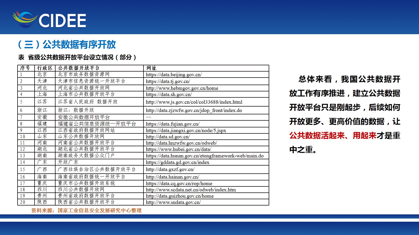 9月5日,2021中國國際數字經濟博覽會期間,工業和信息化部部屬高校成果發布暨對接活動在河北省石家莊(正定)舉辦。國家工業信息安全發展研究中心信息政策所副所長高曉雨在會上發布《我國數據開放共享報告2021》,從對數據開放共享的基本認識、國外數據開放共享的典型政策、我國數據開放共享的基本情況、數據開放共享面臨的問題挑戰、加快數據開放共享的對策建議五個方面做了詳細解讀。