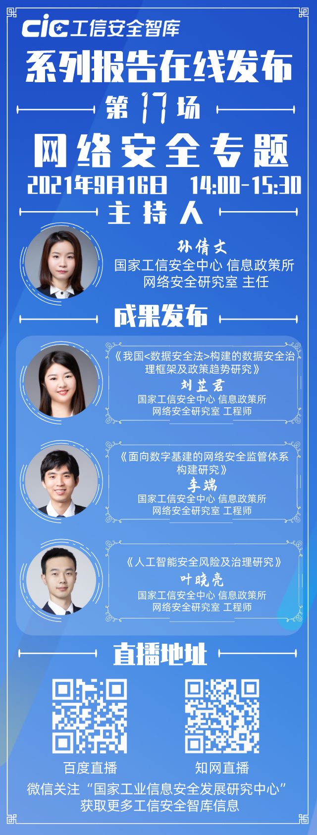 第十七場“工信安全智庫”系列報告在線發布活動將于明日(9月16日)下午2:00準時上線。本次發布活動以“網絡安全”為主題,發布《我國<數據安全法>構建的數據安全治理框架及政策趨勢研究》《面向數字基建的網絡安全監管體系構建研究》《人工智能安全風險及治理研究》三份報告。發布活動將由中心信息政策所網絡安全研究室主任孫倩文主持。