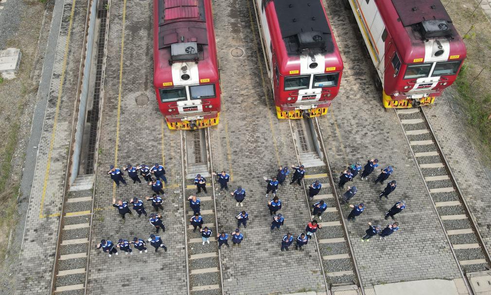 ??8月19日,在肯尼亞內羅畢非洲之星鐵路運營有限責任公司機務運轉整備場,中肯兩國鐵路工作者在機車前站列并組成“3000”字樣,以紀念蒙內鐵路實現安全運營3000天(無人機照片)。新華社記者 楊光 攝